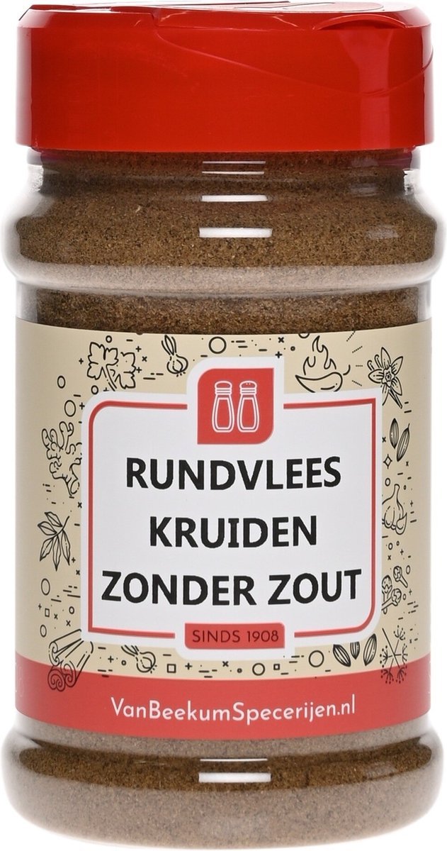 Rundvlees kruiden zonder zout kopen bij Van Beekum Specerijen Bij Van Beekum Specerijen bestel je eenvoudig en snel de beste rundvlees kruiden zonder zout. Onze kruiden worden zorgvuldig geselecteerd en gemengd in onze eigen mengerij, zodat je altijd verzekerd bent van topkwaliteit. Je ontvangt de kruiden in een handige hersluitbare strooibus, waarmee je eenvoudig kunt doseren. Bekijk ook onze andere kruidenmixen zonder zout om jouw keuken compleet te maken.